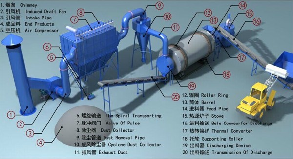 Materials enter the inner side of the drum through the feeding device to realize current flow drying process, and then the materials enter the middle layer of the inner wall through the other end to realize counter current drying process. They are lifted in over and over in the middle layer which advance in two-steps forward and one-step back way. The three-drum dryers absorb heat from both inner drum and middle drum, which extend the drying time and realize the best drying condition. Finally, materials fall into the external layer of the drum from the other end of the middle layer, processing in a rectangle multi-loop way. The dried materials move quickly out of the drum under the hot air, while the wet ones remain because of their own weight. Materials are dried completely inside the rectangle shoveling plate and then cooled by the single drum cooler, thus finishing the whole drying process.